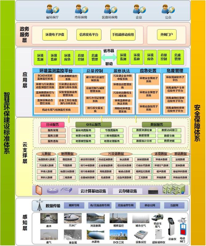 按国家及地方相关法规,制定数据存储、数据交换、数据共享的标准和规范,以云计算、虚拟化和高性能计算等技术手段,整合和分析海量的跨系统、跨行业的环境信息,实现数据的实时处理、海量存储、深度挖掘和模型分析,实现“更深入的智能化”应用层